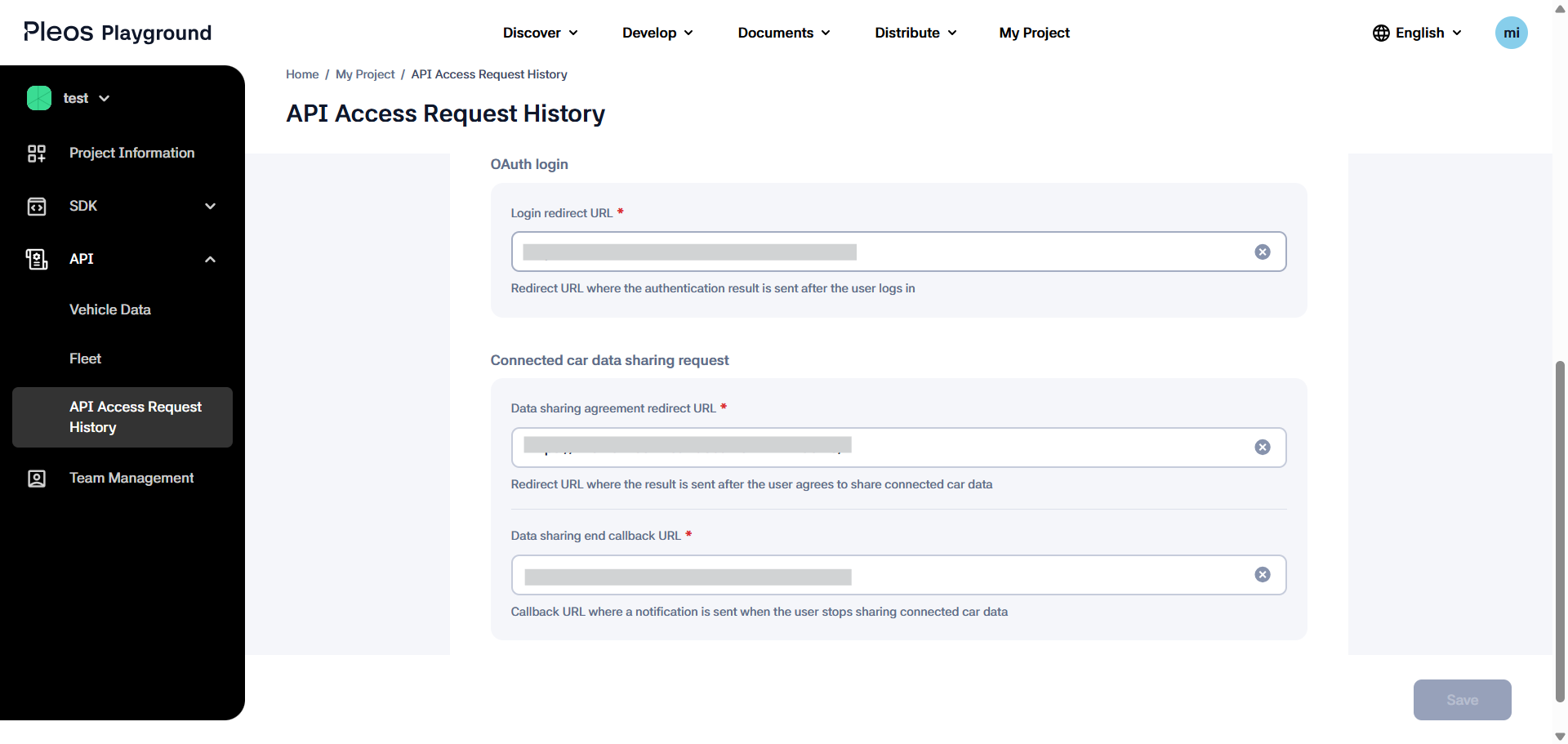 | redirectUrl | string | Enter the OAuth login > Login redirect URL that was provided when requesting Vehicle Data API use under Pleos Playground > My Project. | Required |