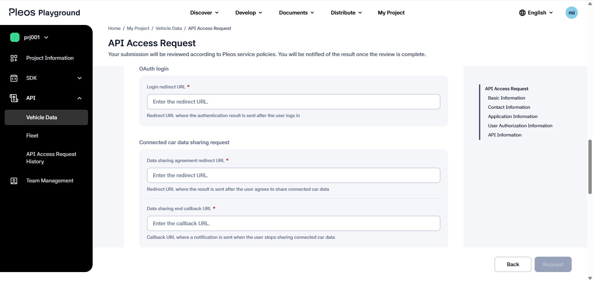 - Among the information entered on the API Access Request screen, the value entered under User Authorization Information > Connected car data sharing request > Data sharing end callback URL is the URL that the service will use to send a notification when the vehicle owner requests to stop data sharing via the vehicle brand’s service.